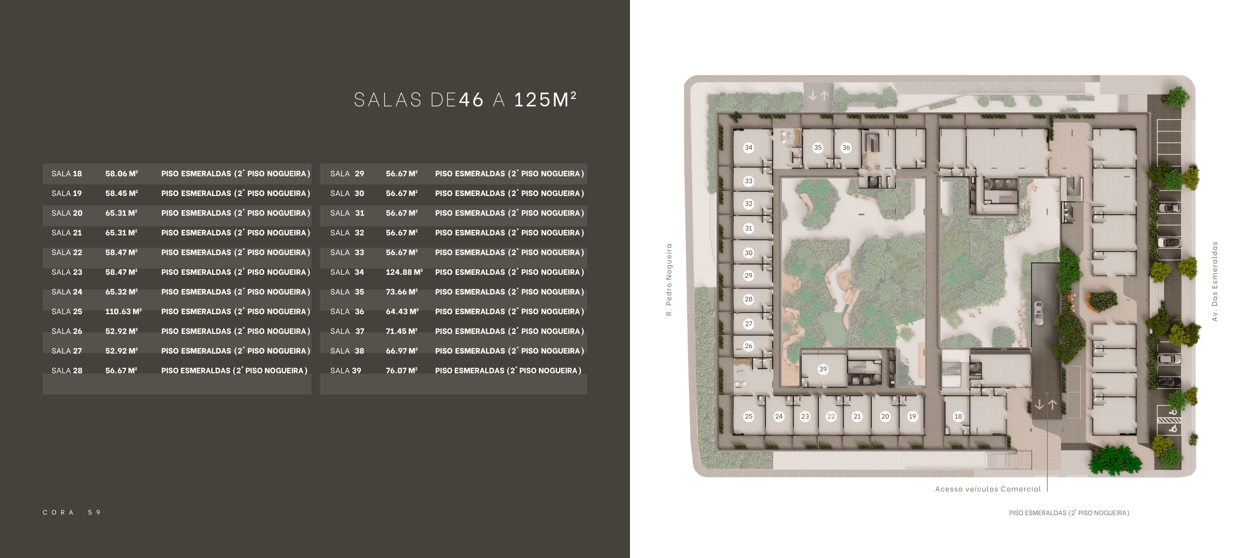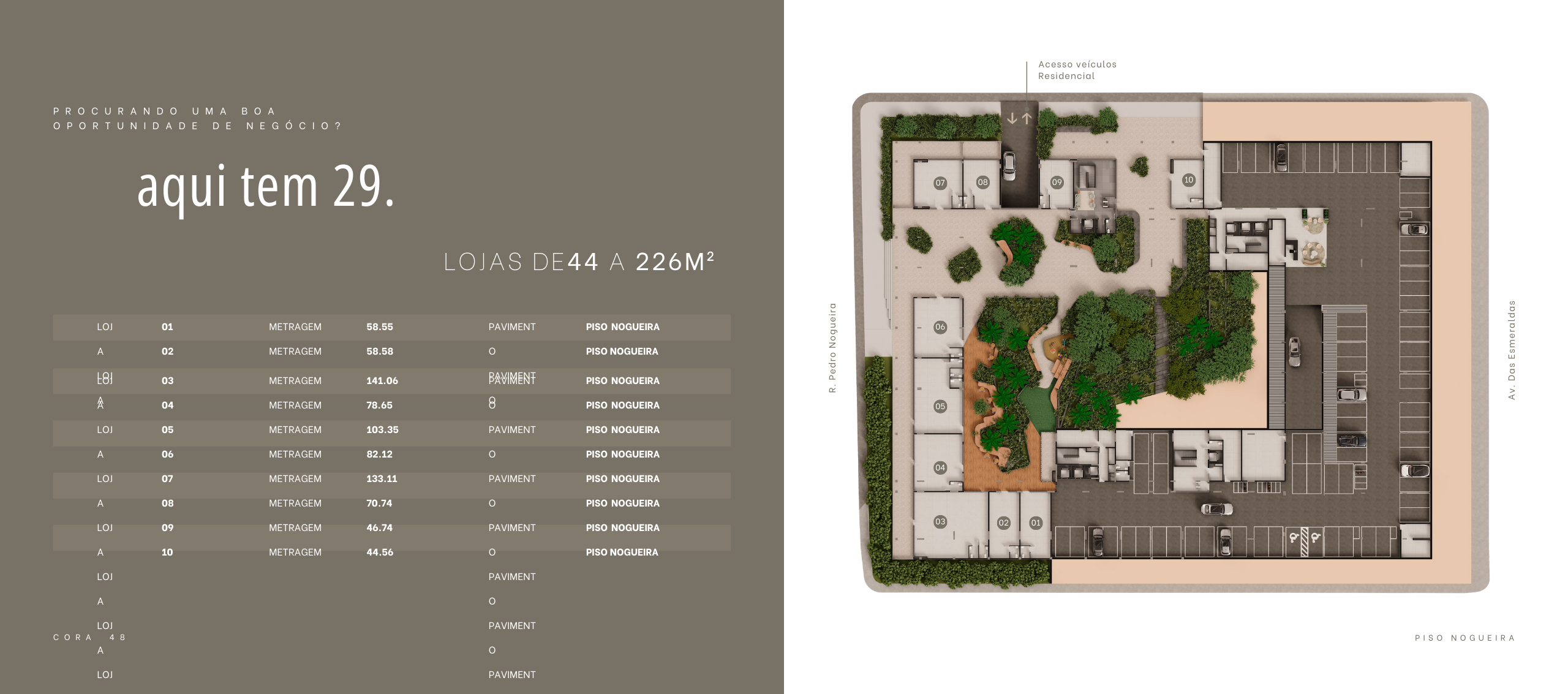 Aqui tudo está perto de você: bares, restaurantes, shopping, supermercado, escolas, padarias, lojas, pista de corrida, ciclovia e quadras esportivas. E com acesso fácil: as quatro laterais de Cora têm passeios largos, que permitem um ir e vir a pé prazeroso e amigável. Já para a circulação de veículos, foi pensada uma “rua pacificada”, que torna mais simples a dinâmica das lojas, salas e moradores e ainda contribui para a mobilidade urbana local.