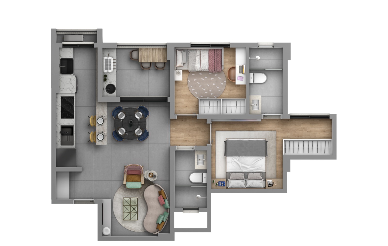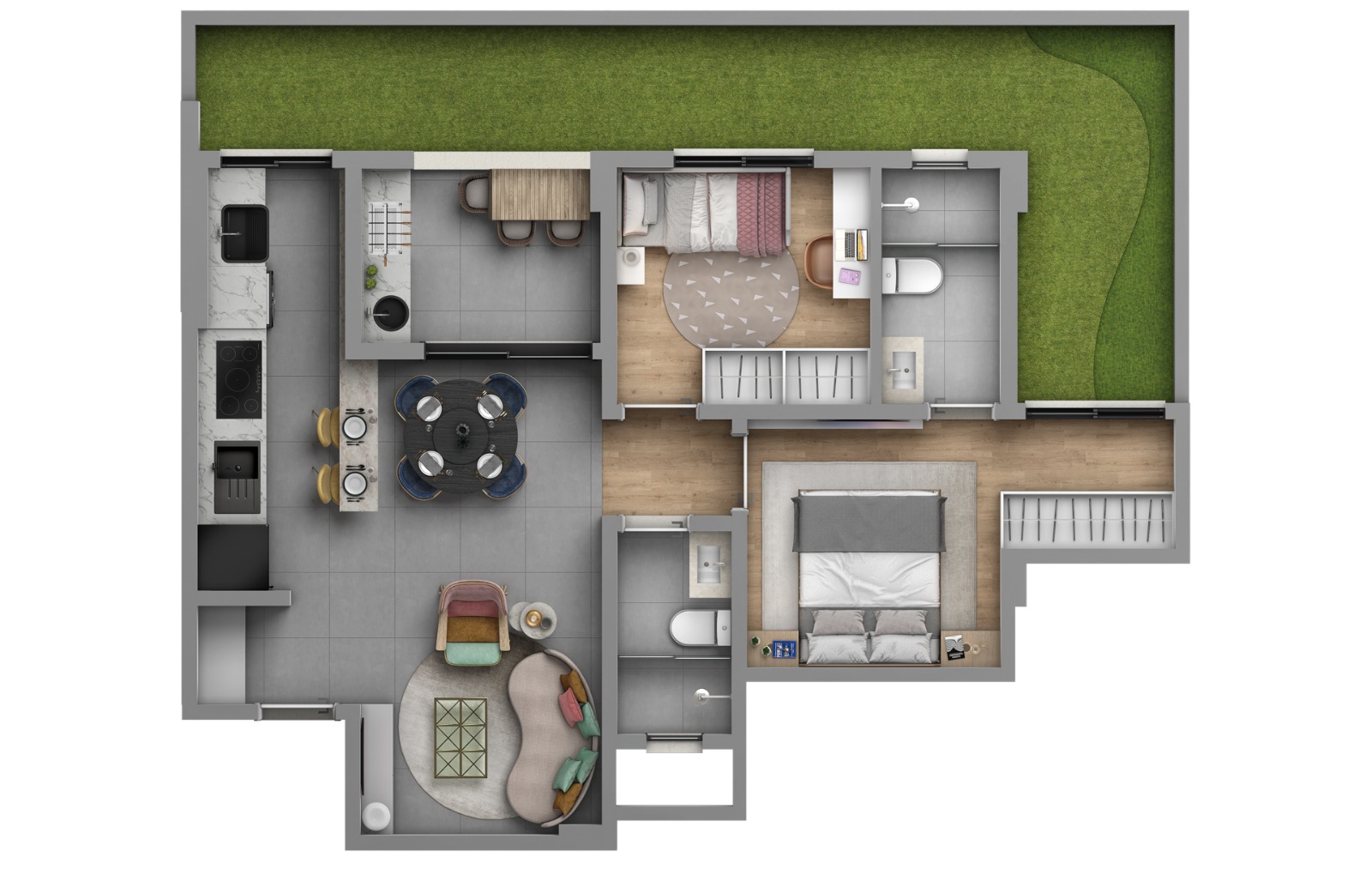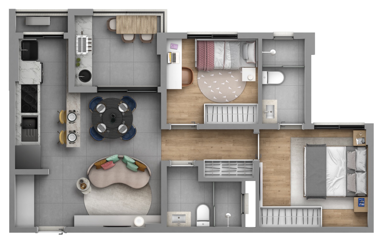 - Sacada com ponto para churrasqueira grill nos apartamentos de 2 dormitórios